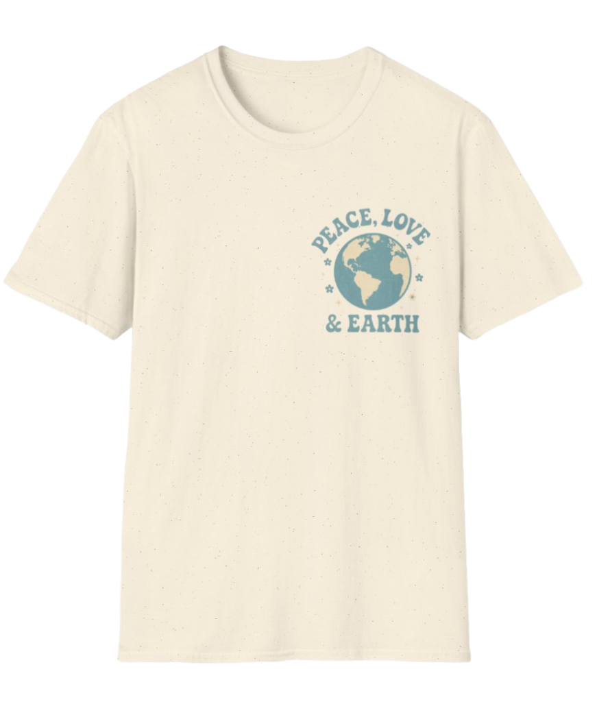 The Peace, Love & Earth tee is what I reach for on grounding days. There’s something about its washed-blue print and vintage-inspired typography that feels timeless — a design that could have existed 50 years ago or yesterday.